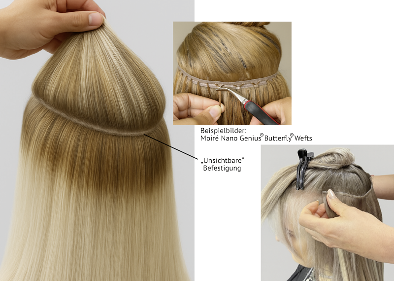 Moiré Nano Genius Butterfly Wefts bestehen aus zwei ultradünnen, ca. 1–2 mm breiten Nano Genius Single Wefts, die über ein sehr schmales, 2mm breites PU Band, miteinander verbunden sind. Darin sind speziell abgestimmte Holes gestanzt, damit die Tressen mit dem Eigenhaar schonend verbunden werden können.